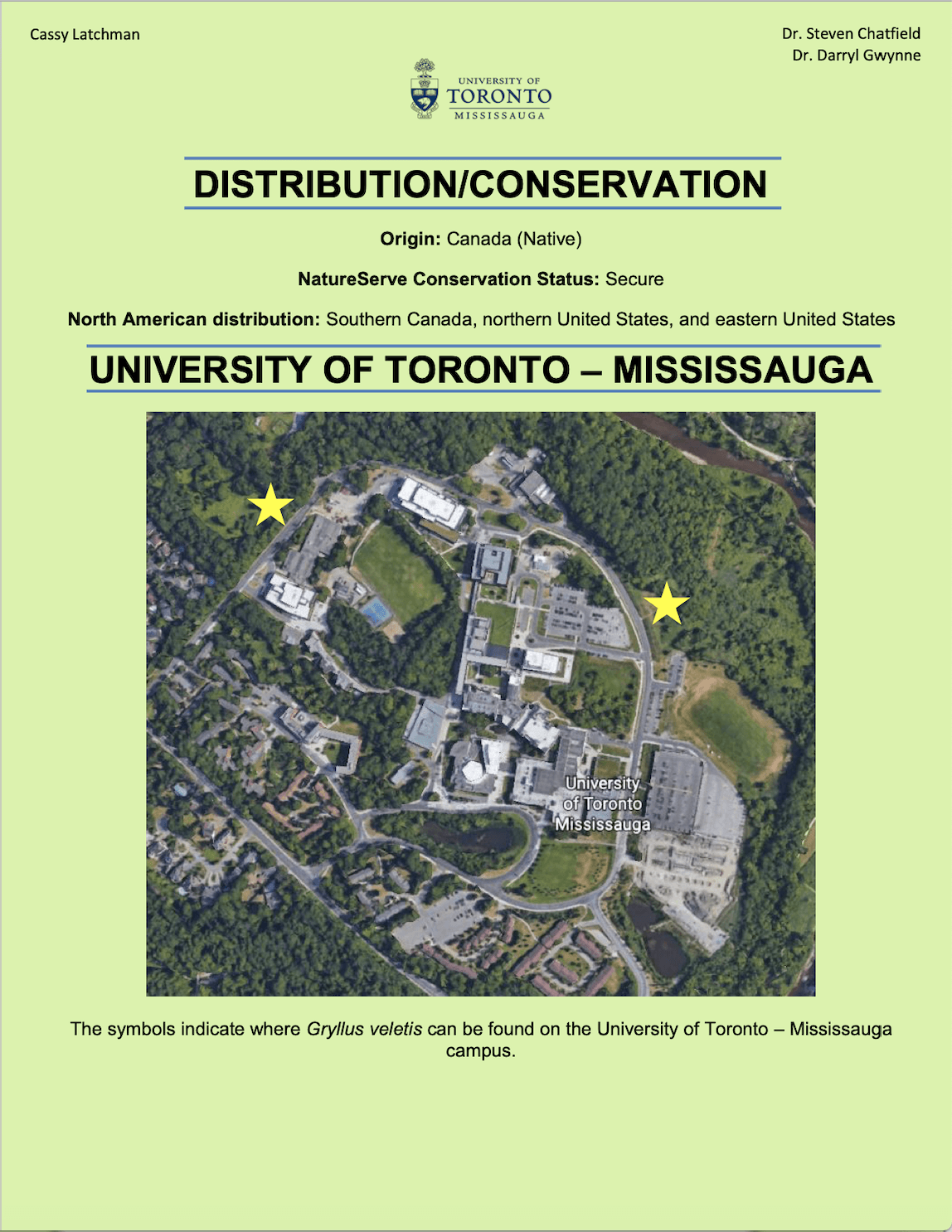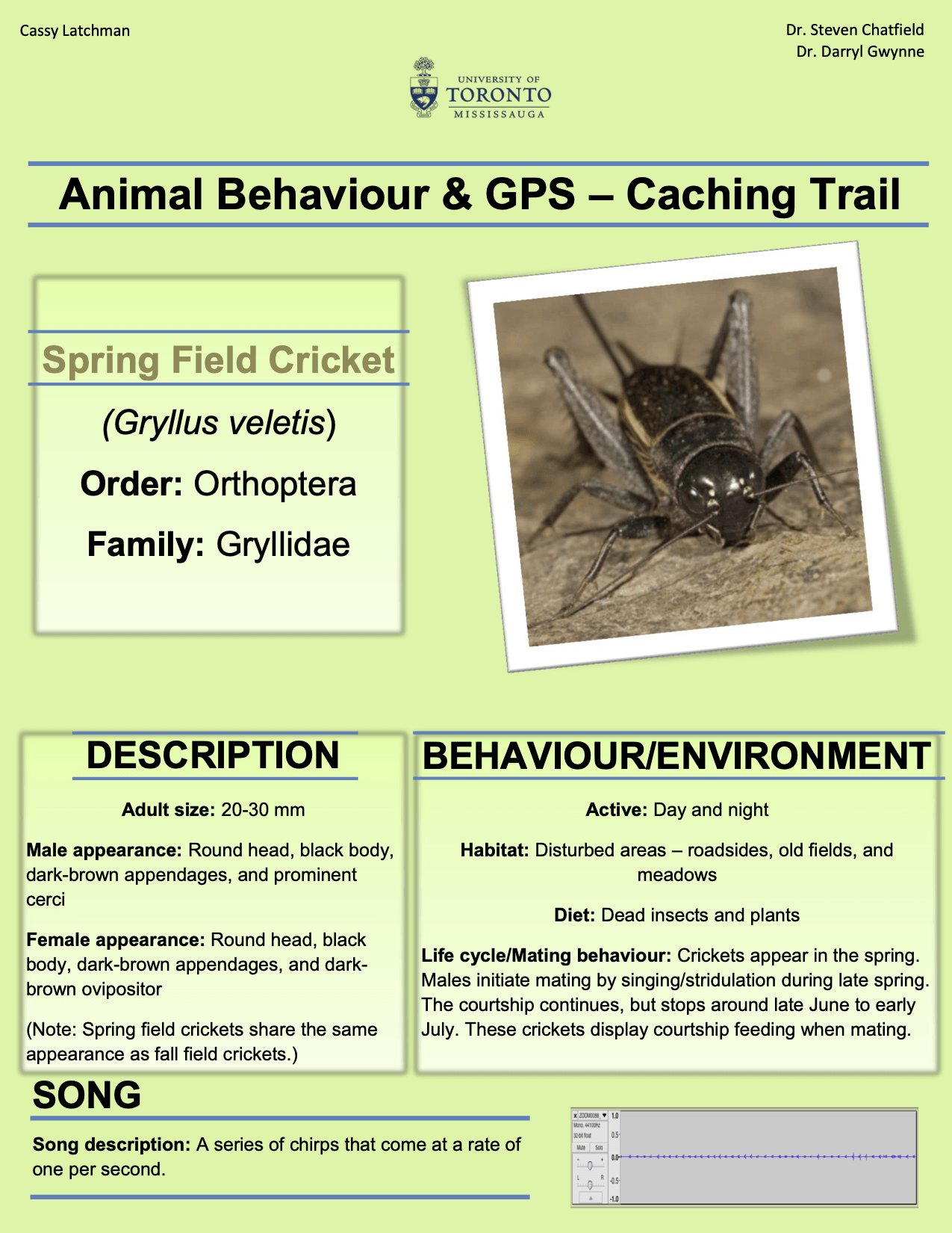 This research project was funded by the University of Toronto (UofT). This project was conducted to enhance the experience for users at the UTM Nature Trail by studying various singing insects (grasshoppers, crickets, katydids, and cicadas), pinpointing their location on the trail, and determining the approximate time of day and month the insects would be out/singing. UofT wanted to the users of the UTM Nature Trail to be able to identify and enjoy the singing insects in the area. Information pamphlets were created based on each singing insect found at the UTM Nature Trail (in addition to other insects in the vicinity).